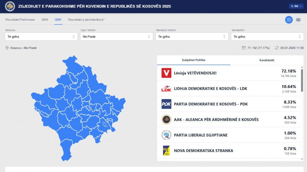 Në përditësimin e fundit të faqes së rezultateve zgjedhore të KQZ-së (11:50), vërehet se në Qendrën e Numërimit dhe Rezultateve (QNR) janë numëruar 77.92 % të votave me postë për zgjedhjet e parakohshme të 28 dhjetorit.